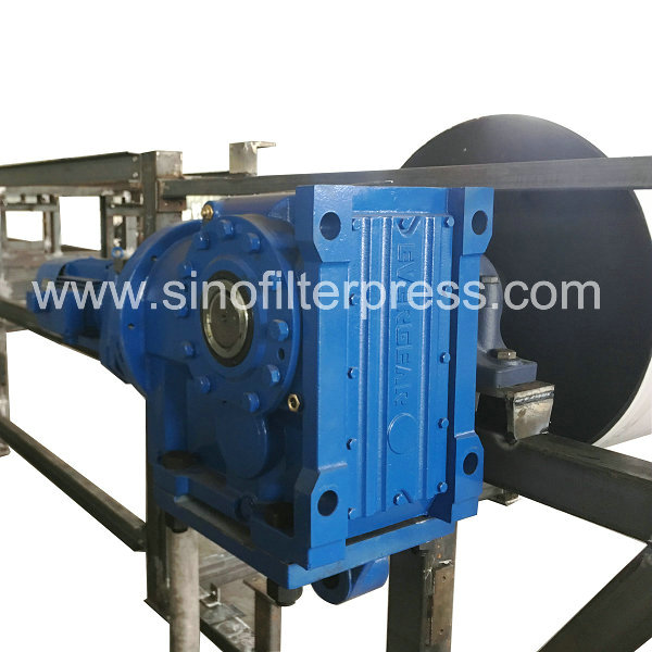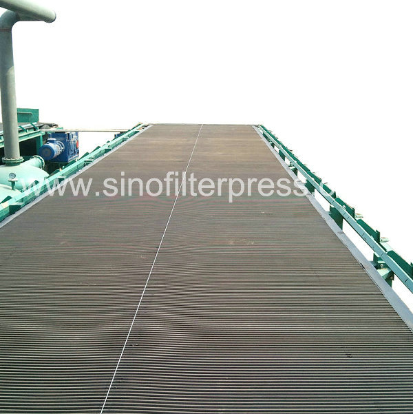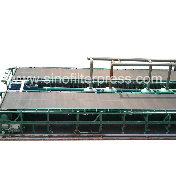 环形胶带由电机经减速拖动连续运行,滤布铺敷在胶带上与之同步运行。胶带与真空室滑动接触(真空室与胶带间有环形磨擦带并通入水形成水密封),当真空室接通真空系统时,在胶带上形成真空抽滤区;料浆由布料器均匀地布在滤布上,在真空的作用下,滤液穿过滤布经胶带上的横沟槽汇总并由小孔进入真空室,固体颗粒被截留而形式滤饼;进入真空的液体经气水分离器排出。随着橡胶带移动已形成的滤饼依次进入滤饼洗涤区、吸干区;最后滤布与胶带分开,在卸滤饼辊处将滤饼卸出;卸除滤饼的滤布经清洗后获得再生;再经过一组支承辊和纠偏装置后重新进入过滤区。
